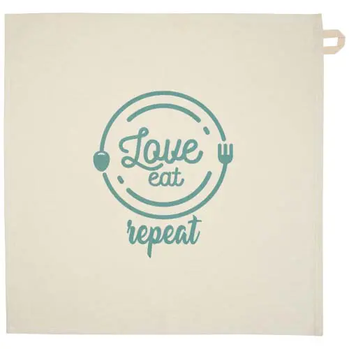 Kjøkkenhåndkle laget av 100 % GRS sertifisert 200 g/m² resirkulert bomull, med en karakteristisk kontrastløkke. Håndklestørrelse: 50 x 50 cm.
