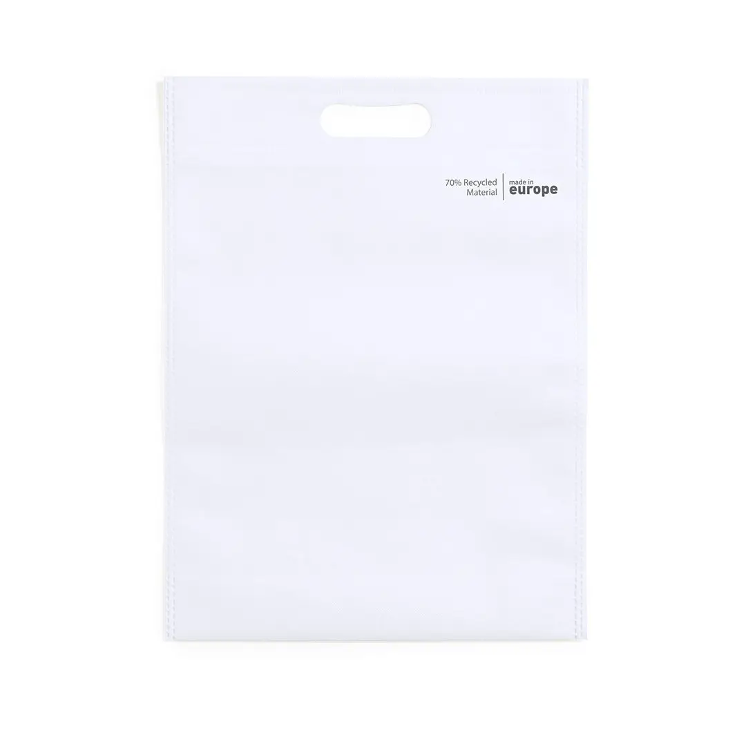 Nature line bag, laget av 70g/m2 resirkulert non-woven. Europeisk laget, med varmeforseglet finish, belg i bunnen, forsterket utstanset håndtak og eco/made in-merke på vesken.