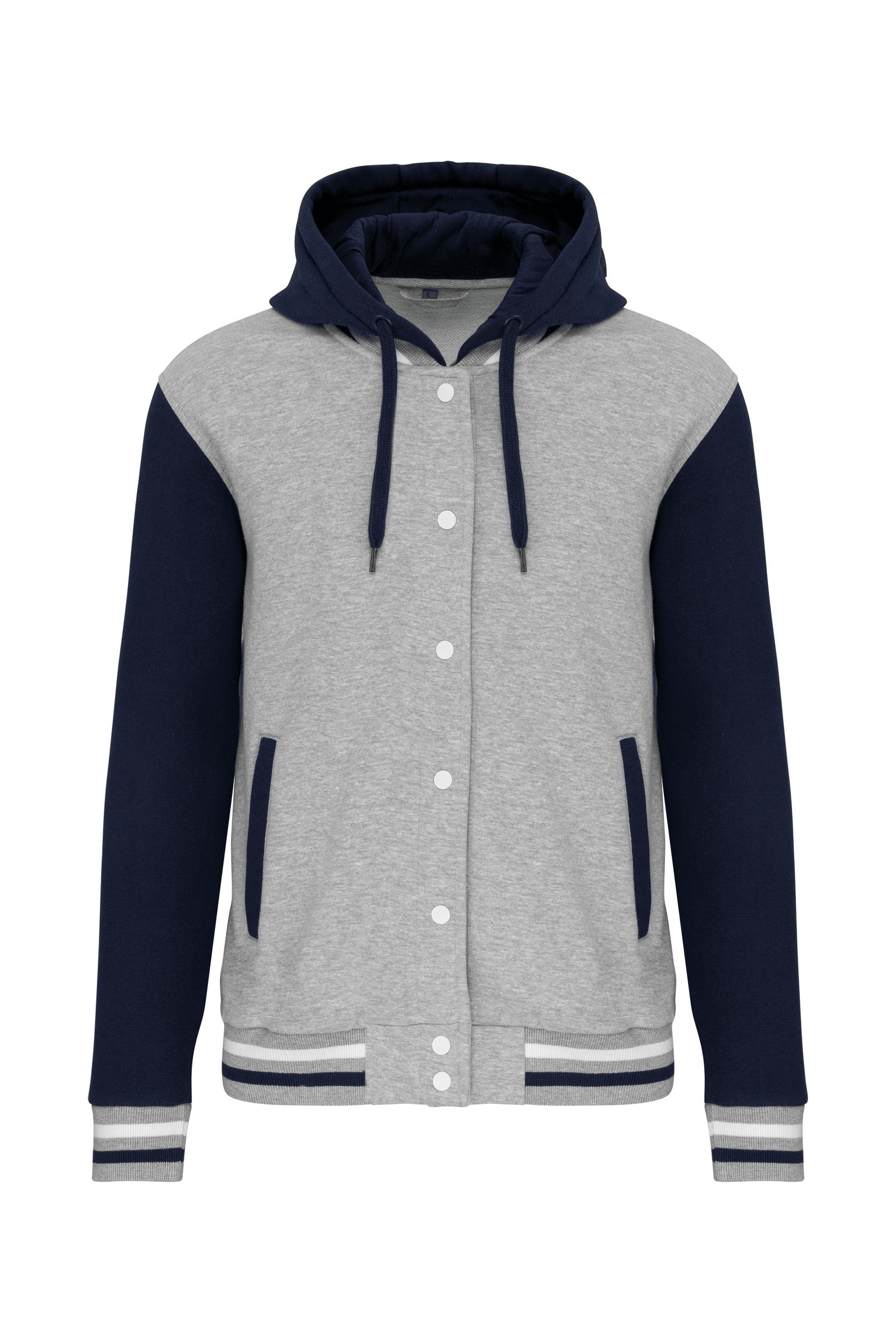 70% bomull / 30% polyester. 3-tråds børstet fleece. Kontrasterte innsatte ermer. 3 panel hette, jersey fôr og kontrastsnorer. Lukkes foran med trykknapper. Ribbet med kontraststriper i halskant, ermer og nederst på plagget. 2 paspolerte lommer foran. Sømtape og hengeløkke i kypert på innsiden av halsen. Ingen merkelapp på halsen, bare en størrelsesetikett for enkel tilpasning. Baseballspilleren er et sant ikon, hun krysser ganger. Det er sett overalt: på gaten, skoler og til og med på den røde løperen. STANDARD 100-sertifikat av OEKO-TEX® nr. CQ1007/7, IFTH. Den tidløse Teddy-jakken, inspirert av den amerikanske college-looken. Optimal komfort. Urban og allsidig stil.