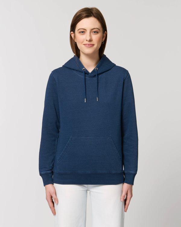 Unisex hettegenseren i denim. Normalt snitt, Rund hals med hette, Langermet, Ikke-børstet fleece. Lukkede ermer Hette foret med hovedstoff Rund snøring, i samme tone, avsluttet med ender med metallfinish Metallmaljer Skjevhet i jerseysøm innenfor halsen Halvmånesøm på innsiden av krage _x00 hette D_x0 hette 1 _x0 hette D_x0 vrbord og c_x0 0x0. Dobbel søm på skuldre, mansjetter og hem Kengurulomme Distressed effekt på alle sømmer Plagg farget med indigo, utseendet på hvert plagg kan variere, fargen kan falme, følg vår pleieetikett Les anbefalingene nøye av inntrykket
