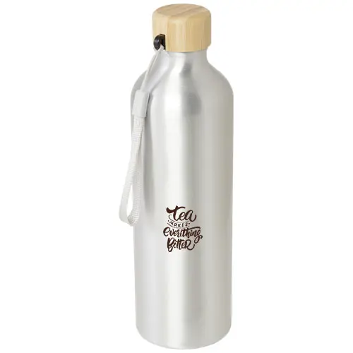 RCS sertifisert vannflaske i resirkulert aluminium med et stilig bambuslokk. Denne lette flasken med én vegg kommer med en stropp for enkel bæring. Bambusen er fra bærekraftige, miljømessige og sosialt ansvarlige kilder. Kapasiteten er 770 ml. Kun håndvask.