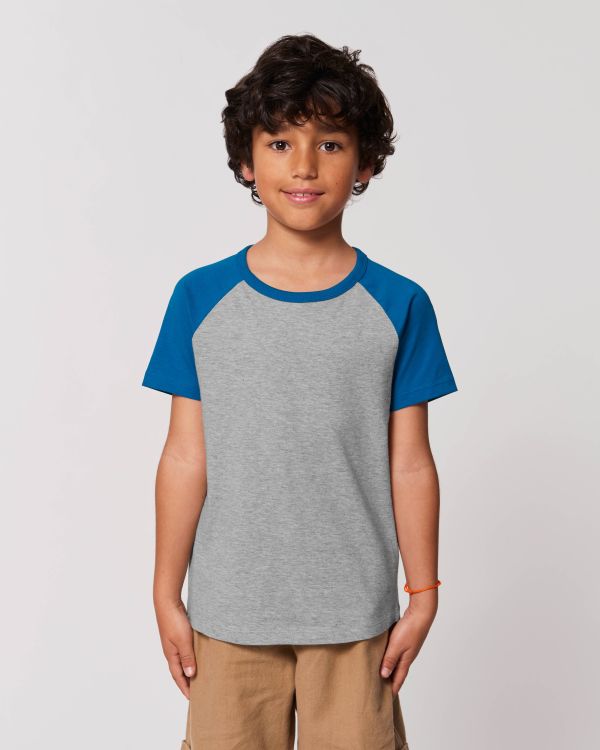 Den kortermede kontrasterende t-skjorten for gutter. Vanlig passform, rund hals, kortermet, enkel jersey strikk. Raglanermer