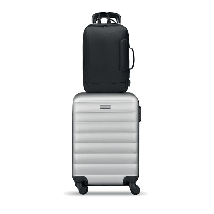 Laptop-ryggsekk i 300D RPET polyester med polstret skulderreim med håndtak og sidelomme. Inkluderer et internt hovedrom for en bærbar datamaskin på opptil 16 tommer med USB type A-kontakt og kabel for å koble til strømbanken (ikke inkludert).