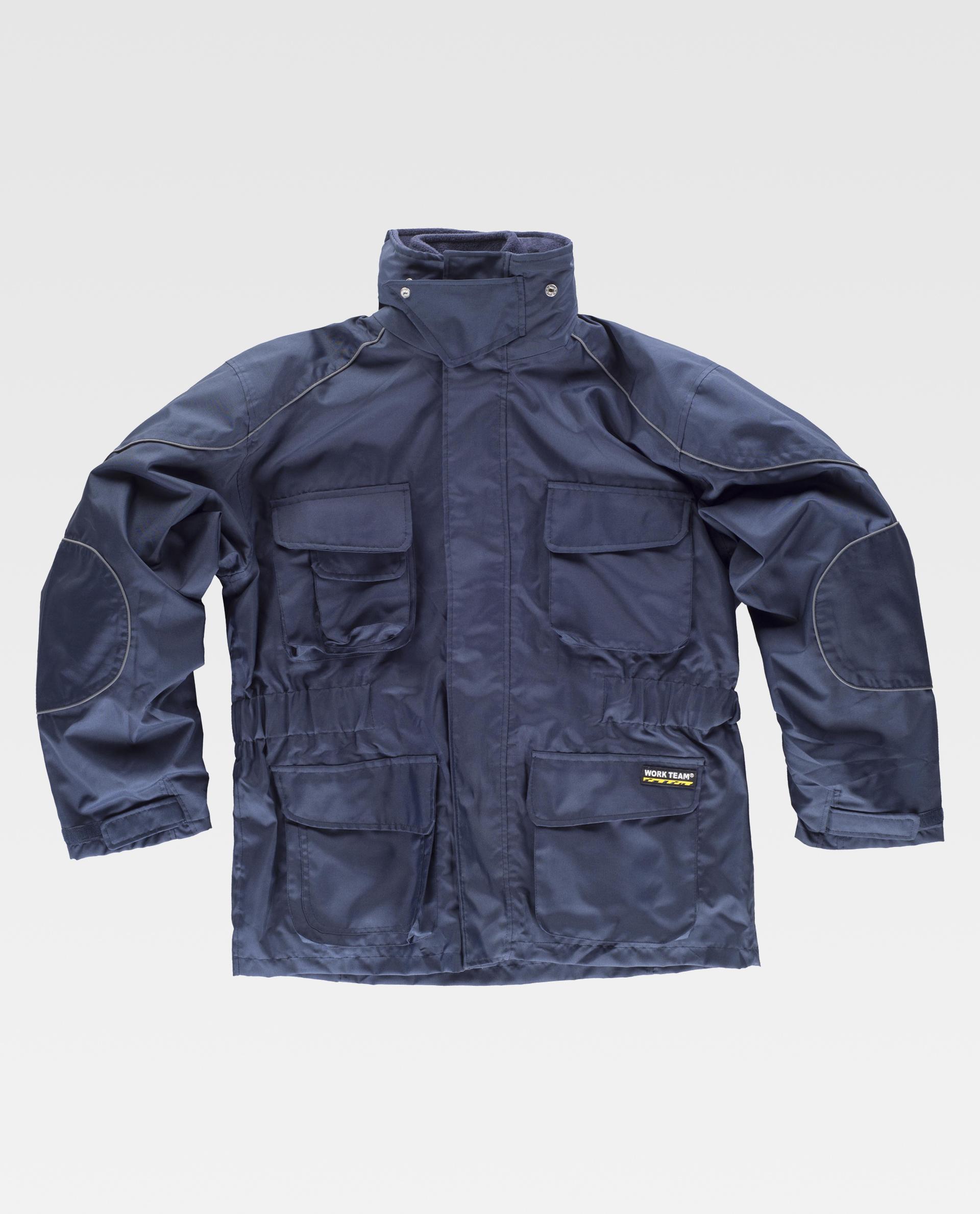 Parkas med avtagbart innerfôr i fleece med glidelås og trykknapper. Eksteriør: Parka i Oxford-stoff med høy hals fôret i fleece med justerbar del med krok-og-øye-feste. Justerbar innerhette med snøring. Dobbelttrekkende nylonglidelåslukking med kroker skjult av en falsk klaff. To brystvesker og to sidebelgposer, en av dem dobbel, alle med borrelåsklaff. Overlappende hjelpelommer. To patchede brystlommer med borrelås og ekstra lomme innvendig. Bærestykke på ryggen og kant med reflekspiping som fortsetter på ermet. Justerbar mansjett med borrelås. Elastikk på sidene av midjen og reflekstape på baksiden. Interiør: Fleecejakke med høy hals og nylonglidelås. To sidelommer med glidelås. Elastisk mansjett. Elastisk snor med justerbart stykke nederst. Parka med avtagbart innerfôr i fleece ved hjelp av glidelåser og kroker.