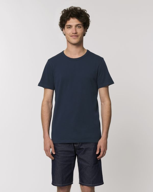 Den lette t-skjorten for ham. Figursydd snitt, rund hals, kortermet, enkel jersey strikk. Tilpasset erme Ribbestrikket krage 1x1 Dobbeltsøm på mansjetter og fald