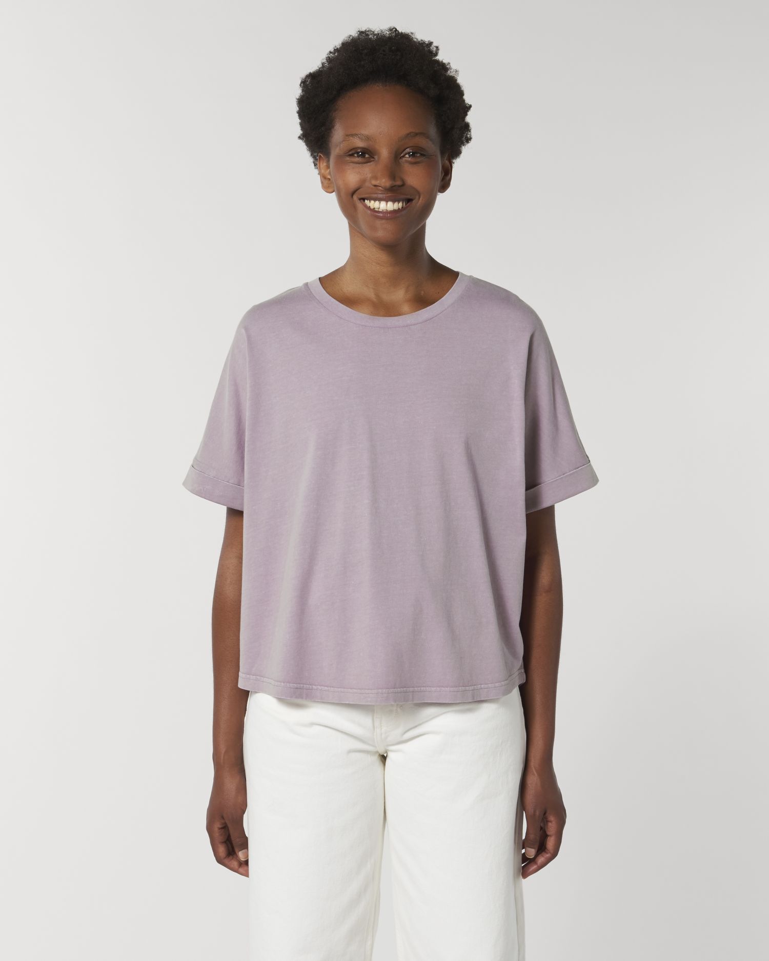 Den fargede t-skjorten med rullede ermer til henne. Overdimensjonert, rund hals, kortermet, enkel jerseystrikk. Flaggermusermer