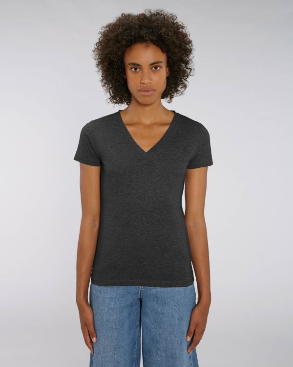 T-skjorten med V-hals til henne. Vanlig passform, V-hals, Kortermet, Single jersey strikk. Tilpasset erme