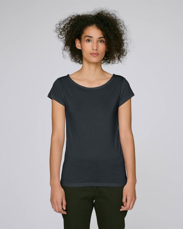 T-skjorten med båthalset til henne. Løs passform, Båthals, Cap Sleeve, Single jersey strikk. Lukket erme Brettet krage med piping inni og Enkel stitch Smal dobbelsøm på mansjetter og fald