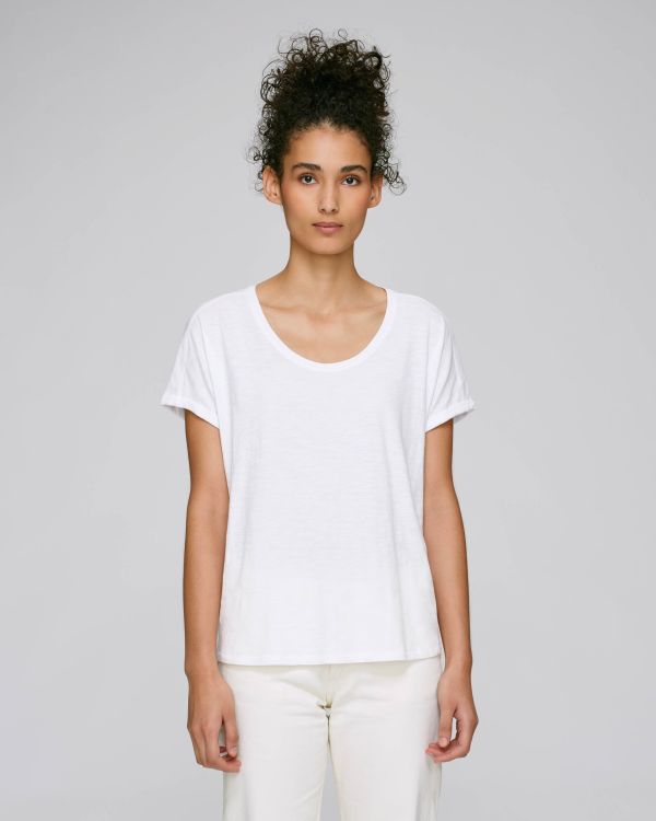 Den løse t-skjorten til henne. Løs passform, rund hals, kortermet, Single jersey strikk i slubgarn. Kimono-ermer
