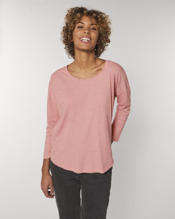 Den 3/4-ermet drop skulder toppen for henne. Løs passform, rund hals, 3/4 erme, Single jersey strikk med slub garn. Nedsatt skuldre