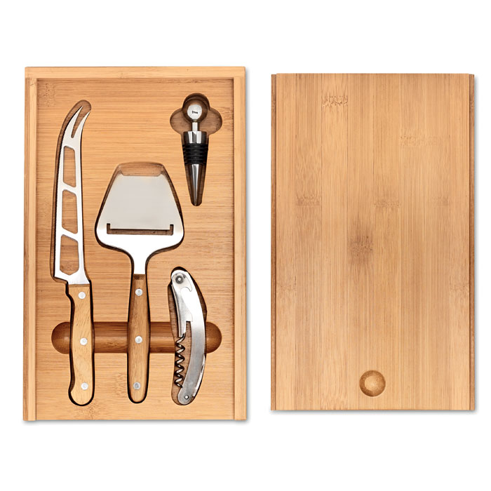 Ostesett med tilbehør til vin. Presentert i et etui laget av bambus. Inkluderer kniv i rustfritt stål, ostehøvel, korketrekker og propp i rustfritt stål. Hos muybuenaidea tilbyr vi deg dette reklamesettet for matelskere som inkluderer tilbehør for å kutte ost og drikke vin. Den beste reklamegaven til din bedrift. Stol på vår femten års erfaring, og du vil motta bestillingen din når og hvor du vil, siden vi har en akutt service. I tillegg er alle virtuelle prøver og transport gratis.